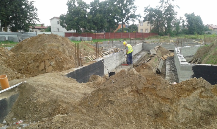 Kontynuowane są prace związane w wykonaniem wykopu. Rozpoczęto tyczenie oraz wykonywanie podkładów betonowych pod ławy fundamentowe.